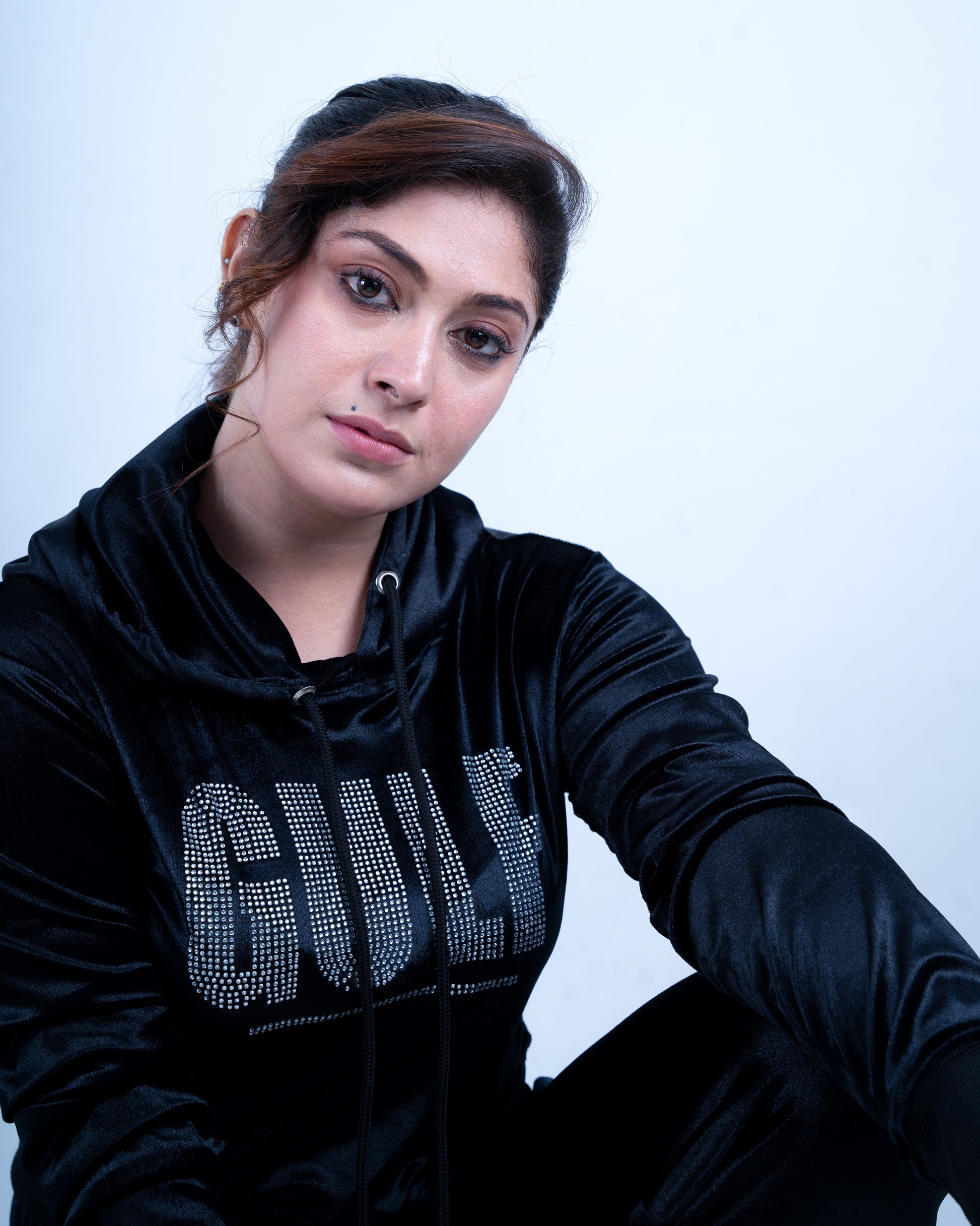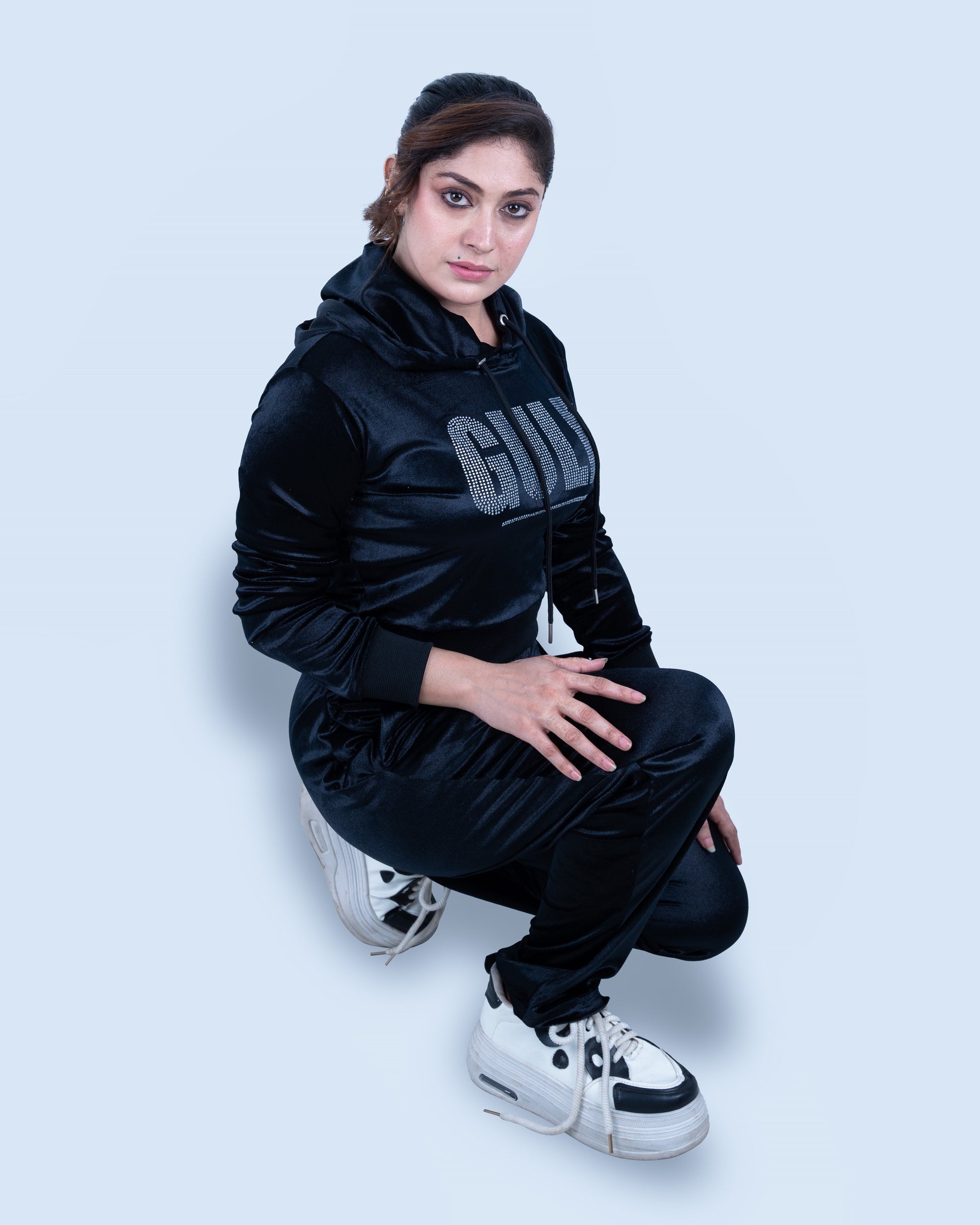 Stylish velour tracksuit with sparkling rhinestone print, perfect for comfort and a trendy look.